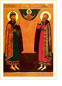 И того ради кровей своих струями обагристася, славная. Темже и венца от Него победная прилета, и нас свыше назираета, молим ва, святая, молите Того, яко да вашими молитвами избавит нас от всяких обстоящих ны зол и подаст нам вся благая, Иже Един Сый прославляемый во святых Своих.
